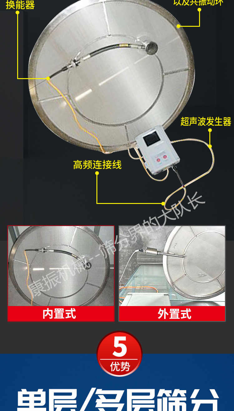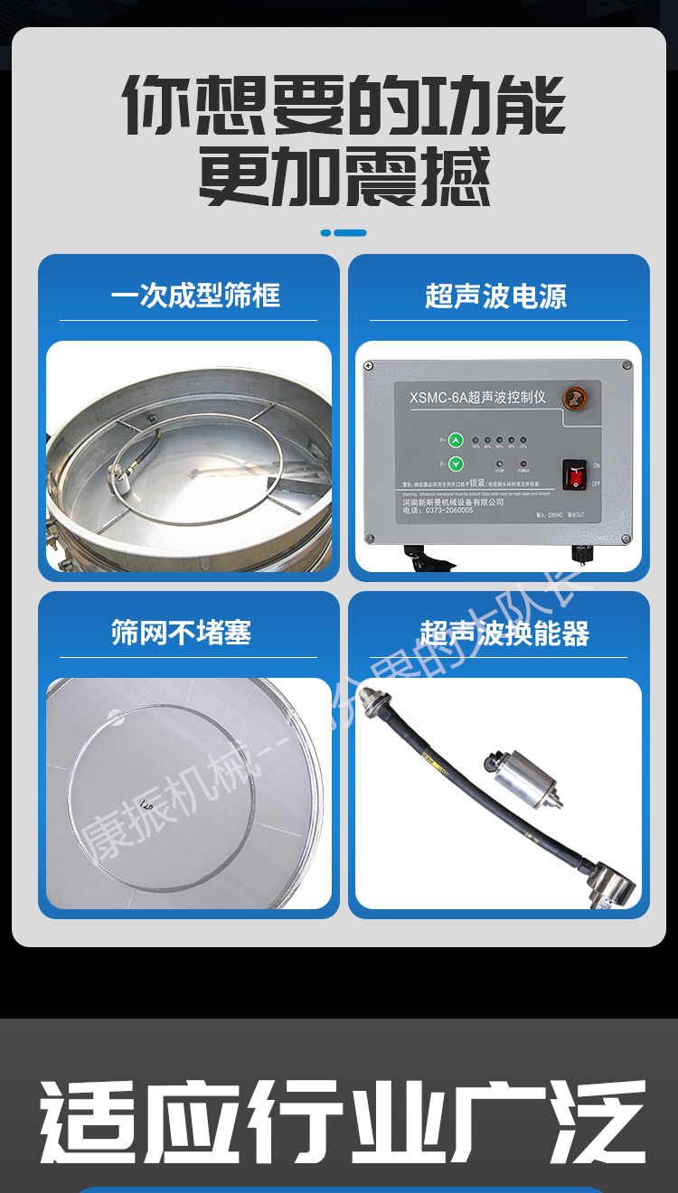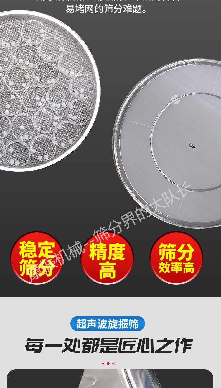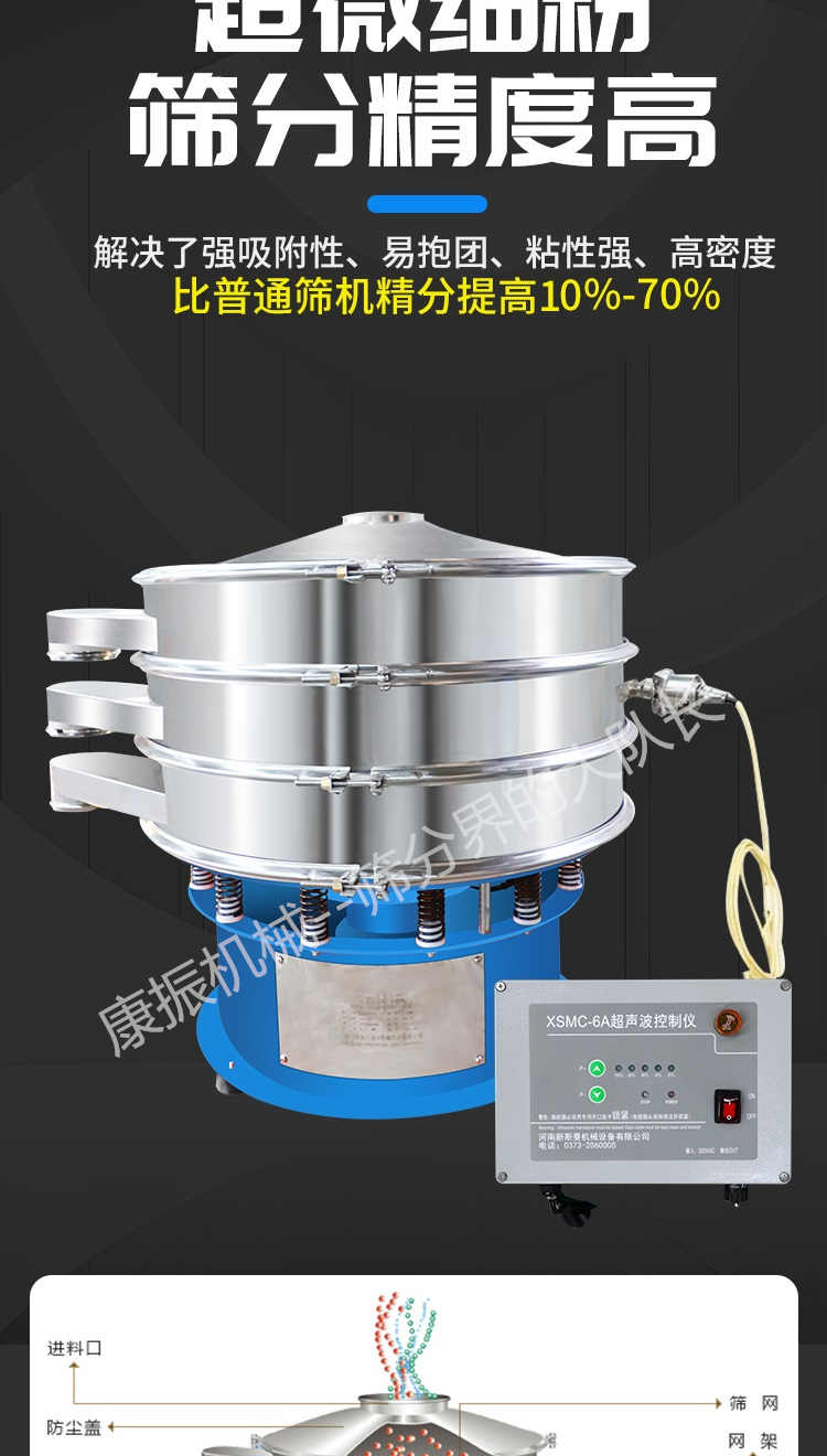 超聲波振動篩是在旋振篩的基礎(chǔ)上引入了超聲波清網(wǎng)裝置,通過將220V、50Hz或110V、60Hz電能轉(zhuǎn)化為18KHz的高頻電能,輸入超聲換能器,將其變成18KHz機(jī)械振動,從而達(dá)到高篩分和迅速清網(wǎng)的目的,使超微細(xì)粉篩分成為易事。該系統(tǒng)在傳統(tǒng)的振動篩基礎(chǔ)上在篩網(wǎng)上引入一個低振幅、高頻率的超聲振動波(機(jī)械波),以改善超微細(xì)粉體的篩分性能。特別適合高附加值精細(xì)粉體的用戶使用。超聲波篩分系統(tǒng)是一種簡單實用、可靠的篩分系統(tǒng),是當(dāng)前網(wǎng)孔堵塞的有效的解決方法。可廣泛應(yīng)用于制藥、冶金、化工、選礦、食品等要求精細(xì)篩分過濾的行業(yè),篩分過濾精度高,有效解決因團(tuán)聚、靜電、強(qiáng)吸附性卡堵網(wǎng)孔等篩分難題,是國內(nèi)篩分行業(yè)的一項重大技術(shù)突破。