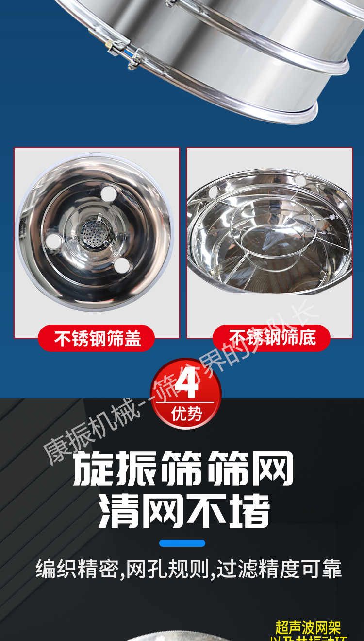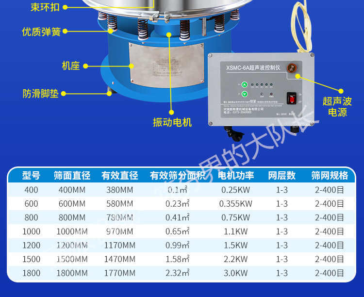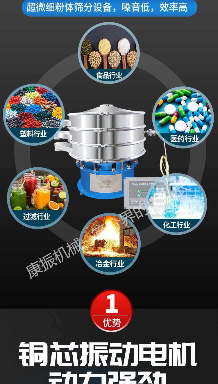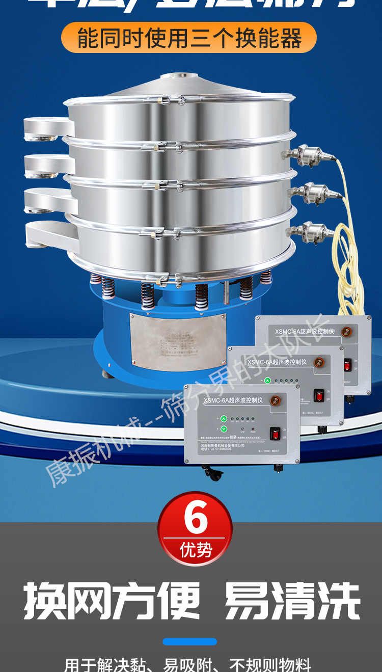 超聲波振動篩是在旋振篩的基礎(chǔ)上引入了超聲波清網(wǎng)裝置,通過將220V、50Hz或110V、60Hz電能轉(zhuǎn)化為18KHz的高頻電能,輸入超聲換能器,將其變成18KHz機(jī)械振動,從而達(dá)到高篩分和迅速清網(wǎng)的目的,使超微細(xì)粉篩分成為易事。該系統(tǒng)在傳統(tǒng)的振動篩基礎(chǔ)上在篩網(wǎng)上引入一個低振幅、高頻率的超聲振動波(機(jī)械波),以改善超微細(xì)粉體的篩分性能。特別適合高附加值精細(xì)粉體的用戶使用。超聲波篩分系統(tǒng)是一種簡單實用、可靠的篩分系統(tǒng),是當(dāng)前網(wǎng)孔堵塞的有效的解決方法。可廣泛應(yīng)用于制藥、冶金、化工、選礦、食品等要求精細(xì)篩分過濾的行業(yè),篩分過濾精度高,有效解決因團(tuán)聚、靜電、強(qiáng)吸附性卡堵網(wǎng)孔等篩分難題,是國內(nèi)篩分行業(yè)的一項重大技術(shù)突破。