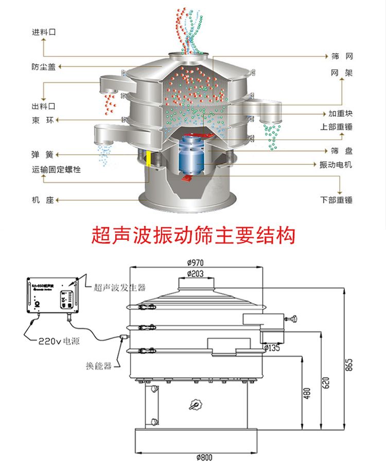 超聲波振動篩主要由換能器、超聲波電源、振動電機、減震彈簧、防塵蓋等部分組成。超聲波振動篩可將各種常用的低頻電能轉化為高達38KHz的高頻電能,再通過超聲換能器,zui終得到一個38KHz機械振動,既能夠提高篩分精度,又可以減少物料的堵網現象。