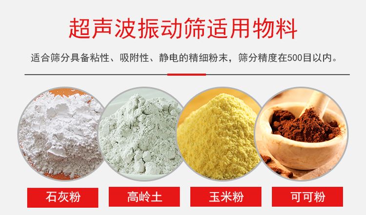 由于超聲波振動篩加裝了超聲波篩分系統,適合篩分具備粘性、吸附性、靜電的精細粉末,篩分精度在500目以內,所以在篩分比較細的物料超聲波振動篩的還是站具很大得優勢。