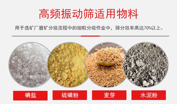 而高頻振動篩用于選礦廠磨礦分級流程中的細粒分級作業,在適當的給料濃度、給料粒度(-200目粒級含量)、以及需求篩下粒度與給料粒度之差小于30個百分點的條件下,篩分效率高達70%以上。