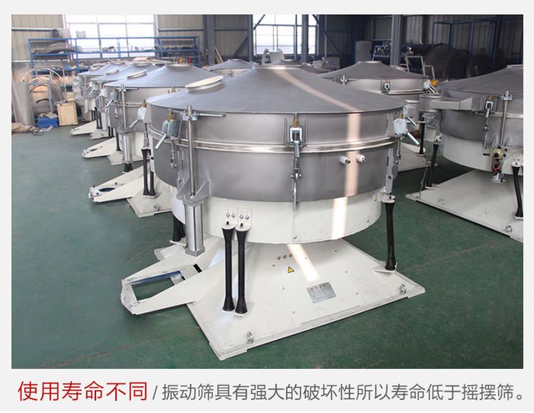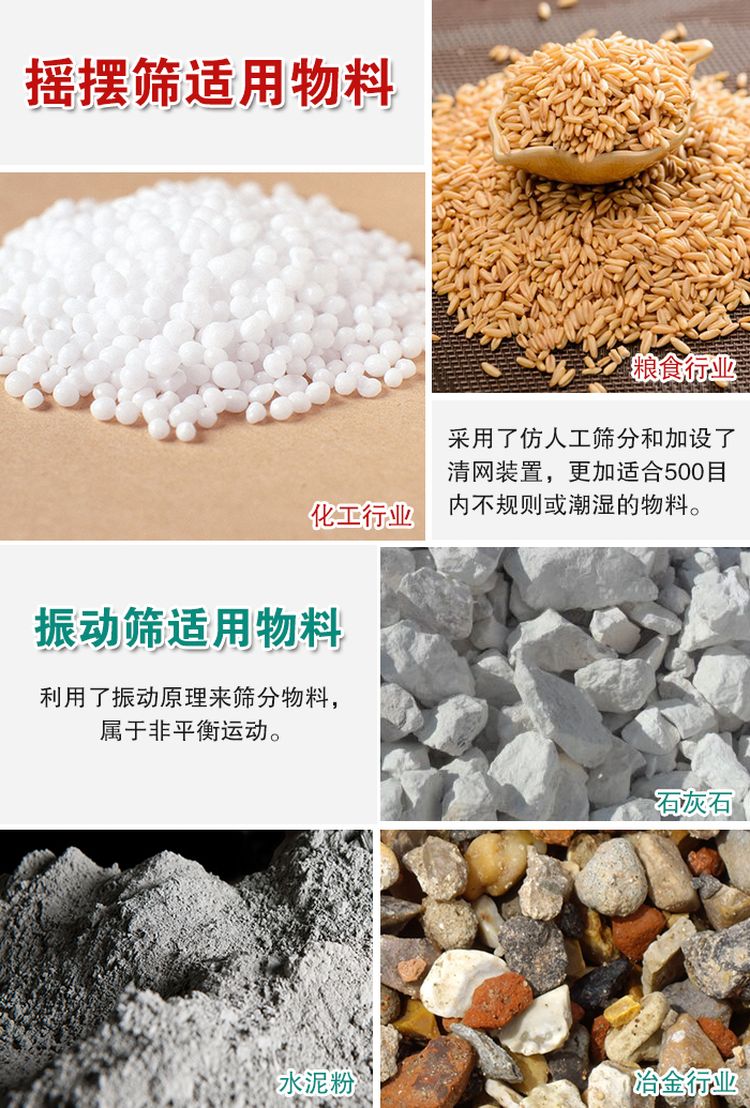 搖擺篩由于采用了仿人工篩分和加設(shè)了清網(wǎng)裝置,所以更加適合500目?jī)?nèi)不規(guī)則或潮濕的物料,克服了普通振動(dòng)篩的堵網(wǎng)風(fēng)險(xiǎn),而振動(dòng)篩屬于非平衡破壞暴力運(yùn)動(dòng),利用了振動(dòng)原理來篩分物料,所以有時(shí)還會(huì)破壞物料,所以對(duì)于一些顆粒狀結(jié)晶焦脆物料,建議使用搖擺篩,其篩分精度可達(dá)95% 以上。
