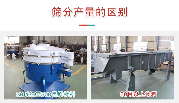 針對(duì)30目以粗上物料而言,振動(dòng)篩和搖擺篩產(chǎn)量基本相同,對(duì)30以細(xì)至500目原材料來說,搖擺篩的生產(chǎn)量則大大高過振動(dòng)篩,一般為振動(dòng)篩的5—10倍。