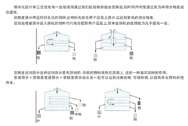 搖擺篩它采用仿生人工篩分的原理,將手工篩分動作的“篩”-(平面圓周運動)和“簸”-(向上拋物料)這兩種運動形式好的結合在一起,解決精細與超精細范圍的粉末與顆粒物料的篩分難題。
