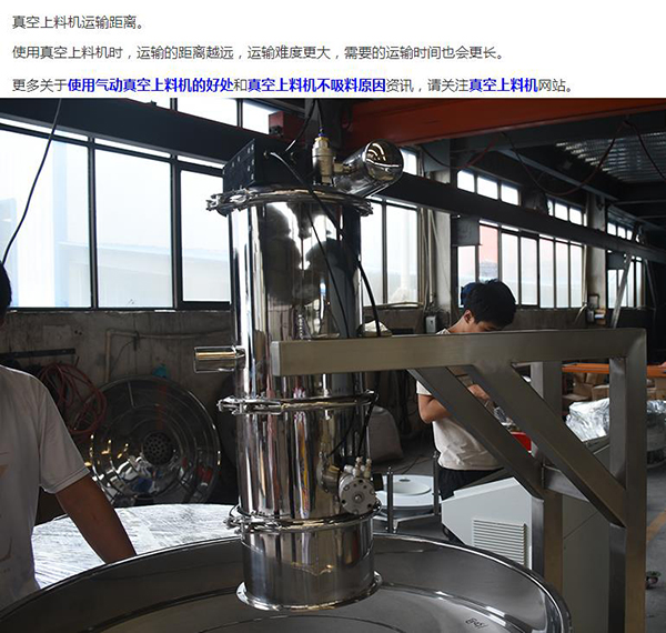 真空上料機(jī)在輸送不同物料的時(shí)候,運(yùn)輸速度和運(yùn)輸效果是不同的。如果物料的質(zhì)量越大,運(yùn)輸時(shí)間就越長(zhǎng),運(yùn)輸效果就越糟糕;如果物料比較潮濕,可能不太適合用真空上料機(jī)進(jìn)行輸送,因?yàn)檫@樣會(huì)導(dǎo)致運(yùn)輸速度減慢,甚至?xí)袣堄辔锪险丛谠O(shè)備上。