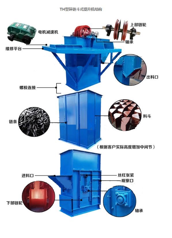TH系列圓環鏈斗式提升機適用于輸送粉狀、粒狀及小塊狀的無磨琢及磨琢性小的物料。TH型環鏈式斗式提升機是一種圓環鏈斗式提升機采用混合式或重力卸料,挖取式裝料。TH型環鏈式斗式提升機適用于輸送堆積密度小于1.5t/m3易于掏取的粉狀、粒狀、小塊狀的底磨琢性物料。如煤、水泥、碎石、砂子、化肥、糧食等。TH型斗式提升機用于各種散狀物料的垂直輸送。適用于輸送粉狀、粒狀、小塊狀物料,物料溫度在250℃以下。